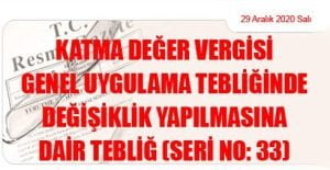 Hazine ve Maliye Bakanlığı (Gelir İdaresi Başkanlığı)’ndan: KATMA DEĞER VERGİSİ GENEL UYGULAMA TEBLİĞİNDE DEĞİŞİKLİK YAPILMASINA DAİR TEBLİĞ (SERİ NO: 33) (29 Aralık 2020 Tarihli
