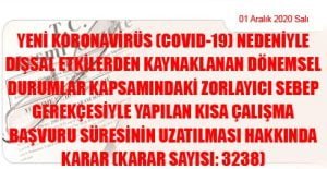 CUMHURBAŞKANI KARARI (01 Aralık 2020 Tarihli ve 31321 Sayılı Resmi Gazete’ de Yayımlanmıştır) Karar Sayısı: 3238 Yeni koronavirüs (Covid-19) nedeniyle dışsal etkilerden kaynaklanan