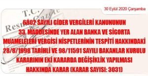 Karar Sayısı: 3031 6802 sayılı Gider Vergileri Kanununun 33. maddesinde yer alan banka ve sigorta muameleleri vergisi nispetlerinin tespiti hakkındaki 28.8.1998 tarihli ve 98/11591 sayılı