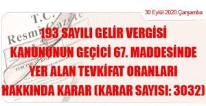Karar Sayısı: 3032 193 sayılı Gelir Vergisi Kanununun geçici 67. maddesinde yer alan tevkifat oranlan hakkındaki ekli Kararın yürürlüğe konulmasına, 193 sayılı Kanunun mezkûr maddesi gereğince karar