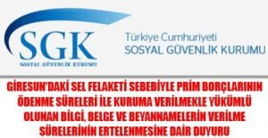 GİRESUN’DAKİ SEL FELAKETİ SEBEBİYLE PRİM BORÇLARININ ÖDENME SÜRELERİ İLE KURUMA VERİLMEKLE YÜKÜMLÜ OLUNAN BİLGİ, BELGE VE BEYANNAMELERİN VERİLME SÜRELERİNİN ERTELENMESİNE DAİR DUYURU (26 Ağustos 2020
