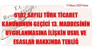 Ticaret Bakanlığından: 6102 SAYILI TÜRK TİCARET KANUNUNUN GEÇİCİ 13. MADDESİNİN UYGULANMASINA İLİŞKİN USUL VE ESASLAR HAKKINDA TEBLİĞ (17 Mayıs 2020 Tarihli ve 31130 Sayılı Resmi Gazete’ de