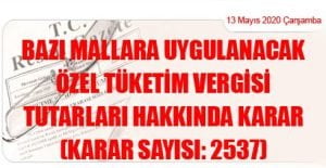 Karar Sayısı: 2537 Bazı mallara uygulanacak özel tüketim vergisi tutarları hakkındaki ekli Kararın yürürlüğe konulmasına, 4760 sayılı Özel Tüketim Vergisi Kanununun 12. maddesi gereğince karar
