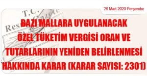 Karar Sayısı: 2301 Bazı mallara uygulanacak özel tüketim vergisi oran ve tutarlarının yeniden belirlenmesi hakkındaki ekli Kararın yürürlüğe konulmasına, 4760 sayılı Özel Tüketim Vergisi Kanununun