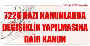 BAZI KANUNLARDA DEĞİŞİKLİK YAPILMASINA DAİR KANUN Kanun No. 7226 Kabul Tarihi: 25/3/2020 (26 Mart 2020 Tarihli ve 31080 – 1.Mükerrer Sayılı Resmi Gazete’ de Yayımlanmıştır)