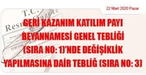 Hazine ve Maliye Bakanlığı (Gelir İdaresi Başkanlığı)’ndan: GERİ KAZANIM KATILIM PAYI BEYANNAMESİ GENEL TEBLİĞİ (SIRA NO: 1)’NDE DEĞİŞİKLİK YAPILMASINA DAİR TEBLİĞ (SIRA NO: 3)