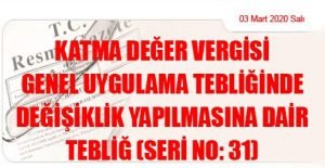 Hazine ve Maliye Bakanlığı (Gelir İdaresi Başkanlığı)’ndan: KATMA DEĞER VERGİSİ GENEL UYGULAMA TEBLİĞİNDE DEĞİŞİKLİK YAPILMASINA DAİR TEBLİĞ (SERİ NO: 31) (03 Mart 2020 Tarihli