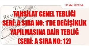 Hazine ve Maliye Bakanlığı (Gelir İdaresi Başkanlığı)’ndan: TAHSİLAT GENEL TEBLİĞİ SERİ: A SIRA NO: 1’DE DEĞİŞİKLİK YAPILMASINA DAİR TEBLİĞ (SERİ: A SIRA NO: 12) (03