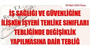 Aile, Çalışma ve Sosyal Hizmetler Bakanlığından: İŞ SAĞLIĞI VE GÜVENLİĞİNE İLİŞKİN İŞYERİ TEHLİKE SINIFLARI TEBLİĞİNDE DEĞİŞİKLİK YAPILMASINA DAİR TEBLİĞ (08 Mart 2020 Tarihli ve
