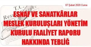 Ticaret Bakanlığından: ESNAF VE SANATKÂRLAR MESLEK KURULUŞLARI YÖNETİM KURULU FAALİYET RAPORU HAKKINDA TEBLİĞ (07 Şubat 2020 Tarihli ve 31032 Sayılı Resmi Gazete’ de