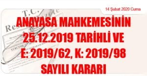 (14 Şubat 2020 Tarihli ve 31039 Sayılı Resmi Gazete’ de Yayımlanmıştır) Anayasa Mahkemesi Başkanlığından: Esas Sayısı : 2019/62 Karar Sayısı: 2019/98 Karar Tarihi: 25/12/2019