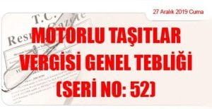 Hazine ve Maliye Bakanlığı (Gelir İdaresi Başkanlığı)’ndan: MOTORLU TAŞITLAR VERGİSİ GENEL TEBLİĞİ (SERİ NO: 52) (27 Aralık 2019 Tarihli ve 30991 – 2.Mükerrer Sayılı