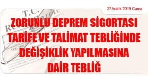 Hazine ve Maliye Bakanlığından: ZORUNLU DEPREM SİGORTASI TARİFE VE TALİMAT TEBLİĞİNDE DEĞİŞİKLİK YAPILMASINA DAİR TEBLİĞ (27 Aralık 2019 Tarihli ve 30991 Sayılı Resmi Gazete’