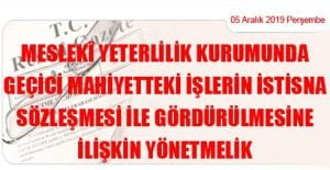 Meslekî Yeterlilik Kurumundan: MESLEKÎ YETERLİLİK KURUMUNDA GEÇİCİ MAHİYETTEKİ İŞLERİN İSTİSNA SÖZLEŞMESİ İLE GÖRDÜRÜLMESİNE İLİŞKİN YÖNETMELİK (05 Aralık 2019 Tarihli ve 30969 Sayılı Resmi Gazete’