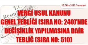Hazine ve Maliye Bakanlığı (Gelir İdaresi Başkanlığı)’ndan: VERGİ USUL KANUNU GENEL TEBLİĞİ (SIRA NO: 240)’NDE DEĞİŞİKLİK YAPILMASINA DAİR TEBLİĞ (SIRA NO: 510) (19 Ekim