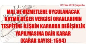 Karar Sayısı: 1594 Ekli “Mal ve Hizmetlere Uygulanacak Katma Değer Vergisi Oranlarının Tespitine İlişkin Kararda Değişiklik Yapılmasına Dair Karar”ın yürürlüğe konulmasına, 3065 sayılı Katma Değer