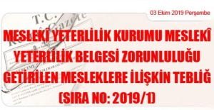 Aile, Çalışma ve Sosyal Hizmetler Bakanlığından: MESLEKÎ YETERLİLİK KURUMU MESLEKÎ YETERLİLİK BELGESİ ZORUNLULUĞU GETİRİLEN MESLEKLERE İLİŞKİN TEBLİĞ (SIRA NO: 2019/1) (03 Ekim 2019 Tarihli