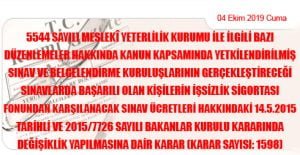 Karar Sayısı: 1598 5544 sayılı Meslekî Yeterlilik Kurumu ile İlgili Bazı Düzenlemeler Hakkında Kanun kapsamında yetkilendirilmiş sınav ve belgelendirme kuruluşlarının gerçekleştireceği sınavlarda başarılı olan kişilerin