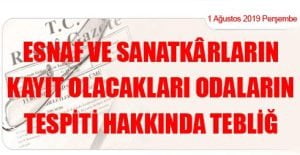 Ticaret Bakanlığından: ESNAF VE SANATKÂRLARIN KAYIT OLACAKLARI ODALARIN TESPİTİ HAKKINDA TEBLİĞ (01 Ağustos 2019 Tarihli ve 30849 Sayılı Resmi Gazete’ de Yayımlanmıştır) Amaç