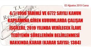 (02 Ağustos 2019 Tarihli ve 30850 Sayılı Resmi Gazete’ de Yayımlanmıştır) Karar Sayısı: 1384 4.7.1956 tarihli ve 6772 sayılı Kanun kapsamına giren kurumlarda