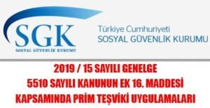 T.C. SOSYAL GÜVENLİK KURUMU BAŞKANLIĞI Sigorta Primleri Genel Müdürlüğü Tarih : 30.05.2019 Sayı : 41481264-207.02-E.8239669 Konu : 5510 sayılı Kanunun ek 16. maddesi kapsamında prim teşviki uygulamaları GENELGE 2019 / 15