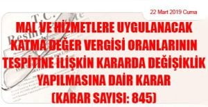 Karar Sayısı: 845 Ekli “Mal ve Hizmetlere Uygulanacak Katma Değer Vergisi Oranlarının Tespitine İlişkin Kararda Değişiklik Yapılmasına Dair Karar”ın yürürlüğe konulmasına, 3065 sayılı Kanunun 28.