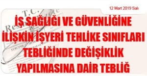 Aile, Çalışma ve Sosyal Hizmetler Bakanlığından: İŞ SAĞLIĞI VE GÜVENLİĞİNE İLİŞKİN İŞYERİ TEHLİKE SINIFLARI TEBLİĞİNDE DEĞİŞİKLİK YAPILMASINA DAİR TEBLİĞ (12 Mart 2019 Tarihli ve