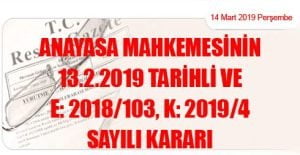(14 Mart 2019 Tarihli ve 30714 Sayılı Resmi Gazete’ de Yayımlanmıştır) Anayasa Mahkemesi Başkanlığından: Esas Sayısı : 2018/103 Karar Sayısı : 2019/4 Karar Tarihi