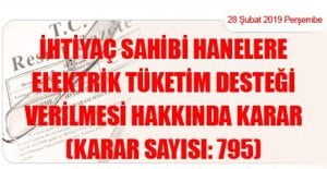 CUMHURBAŞKANI KARARI Karar Sayısı: 795 Ekli “İhtiyaç Sahibi Hanelere Elektrik Tüketim Desteği Verilmesi Hakkında Karar’ın yürürlüğe konulmasına, 6446 sayılı Elektrik Piyasası Kanununun 17 nci