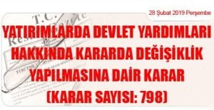 CUMHURBAŞKANI KARARI (28 Şubat 2019 Tarihli ve 30700 Sayılı Resmi Gazete’ de Yayımlanmıştır) Karar Sayısı: 798 Ekli “Yatırımlarda Devlet Yardımları Hakkında Kararda Değişiklik