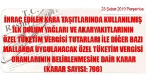 CUMHURBAŞKANI KARARI (28 Şubat 2019 Tarihli ve 30700 Sayılı Resmi Gazete’ de Yayımlanmıştır) Karar Sayısı: 796 Ekli “İhraç Edilen Kara Taşıtlarında Kullanılmış İlk