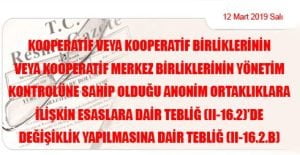 Sermaye Piyasası Kurulundan: KOOPERATİF VEYA KOOPERATİF BİRLİKLERİNİN VEYA KOOPERATİF MERKEZ BİRLİKLERİNİN YÖNETİM KONTROLÜNE SAHİP OLDUĞU ANONİM ORTAKLIKLARA İLİŞKİN ESASLARA DAİR TEBLİĞ (II-16.2)’DE DEĞİŞİKLİK YAPILMASINA DAİR