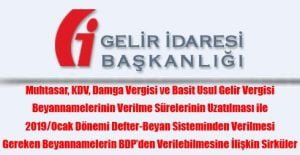 Muhtasar, KDV, Damga Vergisi ve Basit Usul Gelir Vergisi Beyannamelerinin Verilme Sürelerinin Uzatılması ile 2019/Ocak Dönemi Defter-Beyan Sisteminden Verilmesi Gereken Beyannamelerin BDP’den Verilebilmesine İlişkin Sirküler