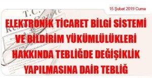 Ticaret Bakanlığından: ELEKTRONİK TİCARET BİLGİ SİSTEMİ VE BİLDİRİM YÜKÜMLÜLÜKLERİ HAKKINDA TEBLİĞDE DEĞİŞİKLİK YAPILMASINA DAİR TEBLİĞ (15 Şubat 2019 Tarihli ve 30687 Sayılı Resmi Gazete’