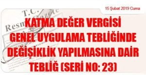 Hazine ve Maliye Bakanlığı (Gelir İdaresi Başkanlığı)’ndan: KATMA DEĞER VERGİSİ GENEL UYGULAMA TEBLİĞİNDE DEĞİŞİKLİK YAPILMASINA DAİR TEBLİĞ (SERİ NO: 23) (15 Şubat 2019 Tarihli