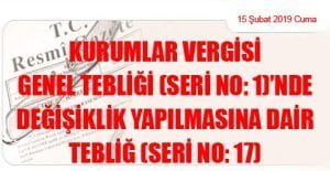 Hazine ve Maliye Bakanlığı (Gelir İdaresi Başkanlığı)ndan: KURUMLAR VERGİSİ GENEL TEBLİĞİ (SERİ NO: 1)’NDE DEĞİŞİKLİK YAPILMASINA DAİR TEBLİĞ (SERİ NO: 17) (15 Şubat 2019