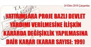 Yatırımlara Proje Bazlı Devlet Yardımı Verilmesine İlişkin Kararda Değişiklik Yapılmasına Dair Karar (Karar Sayısı: 199)