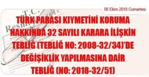 Türk Parası Kıymetini Koruma Hakkında 32 Sayılı Karara İlişkin Tebliğ (Tebliğ No: 2008-32/34)’de Değişiklik Yapılmasına Dair Tebliğ (No: 2018-32/51)