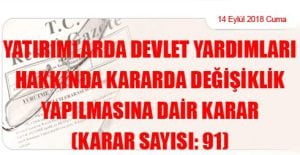 (14 Eylül 2018 Tarihli ve 30535 Sayılı Resmi Gazete’ de Yayımlanmıştır) Karar Sayısı: 91 Ekli “Yatırımlarda Devlet Yardımları Hakkında Kararda Değişiklik Yapılmasına Dair