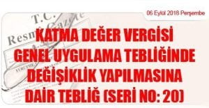 Hazine ve Maliye Bakanlığı (Gelir İdaresi Başkanlığı)’ndan: KATMA DEĞER VERGİSİ GENEL UYGULAMA TEBLİĞİNDE DEĞİŞİKLİK YAPILMASINA DAİR TEBLİĞ (SERİ NO: 20) (06 Eylül 2018 Tarihli