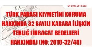 Hazine ve Maliye Bakanlığından: TÜRK PARASI KIYMETİNİ KORUMA HAKKINDA 32 SAYILI KARARA İLİŞKİN TEBLİĞ (İHRACAT BEDELLERİ HAKKINDA) (TEBLİĞ NO: 2018-32/48) (04 Eylül 2018 Tarihli