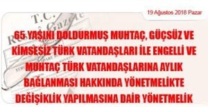 Aile, Çalışma ve Sosyal Hizmetler Bakanlığından: 65 YAŞINI DOLDURMUŞ MUHTAÇ, GÜÇSÜZ VE KİMSESİZ TÜRK VATANDAŞLARI İLE ENGELLİ VE MUHTAÇ TÜRK VATANDAŞLARINA AYLIK BAĞLANMASI HAKKINDA YÖNETMELİKTE DEĞİŞİKLİK