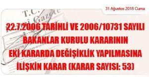Karar Sayısı: 53 22.7.2006 tarihli ve 2006/10731 sayılı Bakanlar Kurulu Kararının eki Kararda değişiklik yapılmasına ilişkin ekli Kararın yürürlüğe konulmasına, 193 sayılı Gelir Vergisi Kanununun