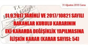 Karar Sayısı: 54 11.9.2017 tarihli ve 2017/10821 sayılı Bakanlar Kurulu Kararının eki Kararda değişiklik yapılmasına ilişkin ekli Kararın yürürlüğe konulmasına, 4691 sayılı Kanunun geçici 2.
