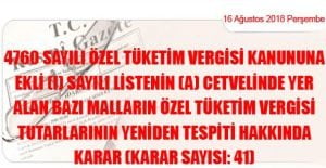 (16 Ağustos 2018 Tarihli ve 30511 Sayılı Resmi Gazete’ de Yayımlanmıştır) Karar Sayısı: 41 4760 sayılı Özel Tüketim Vergisi Kanununa ekli (I) sayılı