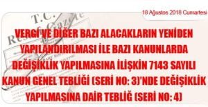 Maliye Bakanlığı (Gelir İdaresi Başkanlığı)’ndan: VERGİ VE DİĞER BAZI ALACAKLARIN YENİDEN YAPILANDIRILMASI İLE BAZI KANUNLARDA DEĞİŞİKLİK YAPILMASINA İLİŞKİN 7143 SAYILI KANUN GENEL TEBLİĞİ (SERİ