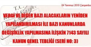 Maliye Bakanlığı (Gelir İdaresi Başkanlığı)’ndan: VERGİ VE DİĞER BAZI ALACAKLARIN YENİDEN YAPILANDIRILMASI İLE BAZI KANUNLARDA DEĞİŞİKLİK YAPILMASINA İLİŞKİN 7143 SAYILI KANUN GENEL TEBLİĞİ (SERİ NO: