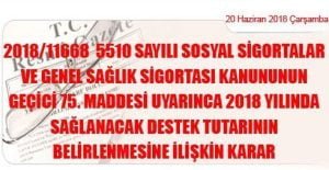 Karar Sayısı : 2018/11668 5510 sayılı Sosyal Sigortalar ve Genel Sağlık Sigortası Kanununun geçici 75. maddesi uyarınca 2018 yılında sağlanacak destek tutarının belirlenmesine ilişkin ekli