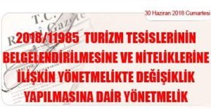 Karar Sayısı : 2018/11985 Ekli “Turizm Tesislerinin Belgelendirilmesine ve Niteliklerine İlişkin Yönetmelikte Değişiklik Yapılmasına Dair Yönetmelik”in yürürlüğe konulması; Kültür ve Turizm Bakanlığının 4.6.2018 tarihli ve 481159 sayılı