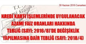 Türkiye Cumhuriyet Merkez Bankasından: KREDİ KARTI İŞLEMLERİNDE UYGULANACAK AZAMİ FAİZ ORANLARI HAKKINDA TEBLİĞ (SAYI: 2016/8)’DE DEĞİŞİKLİK YAPILMASINA DAİR TEBLİĞ (SAYI: 2018/4) (30 Haziran 2018